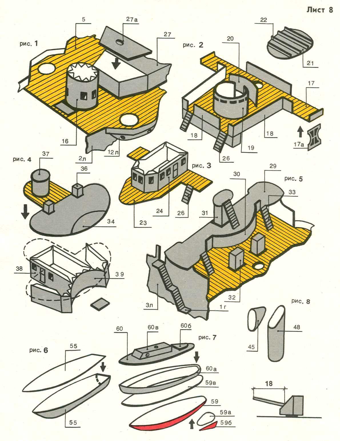 Деталь 59 в наклеить на картон. Сборка шлюпок и паровых катеров показана